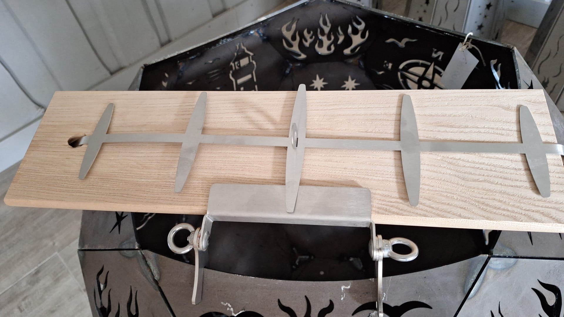 Weiterhin lässt sich unser Flammlachsbrett , Dank unserer innovativen Halterung, auch waagerecht an der Feuerstelle platzieren.